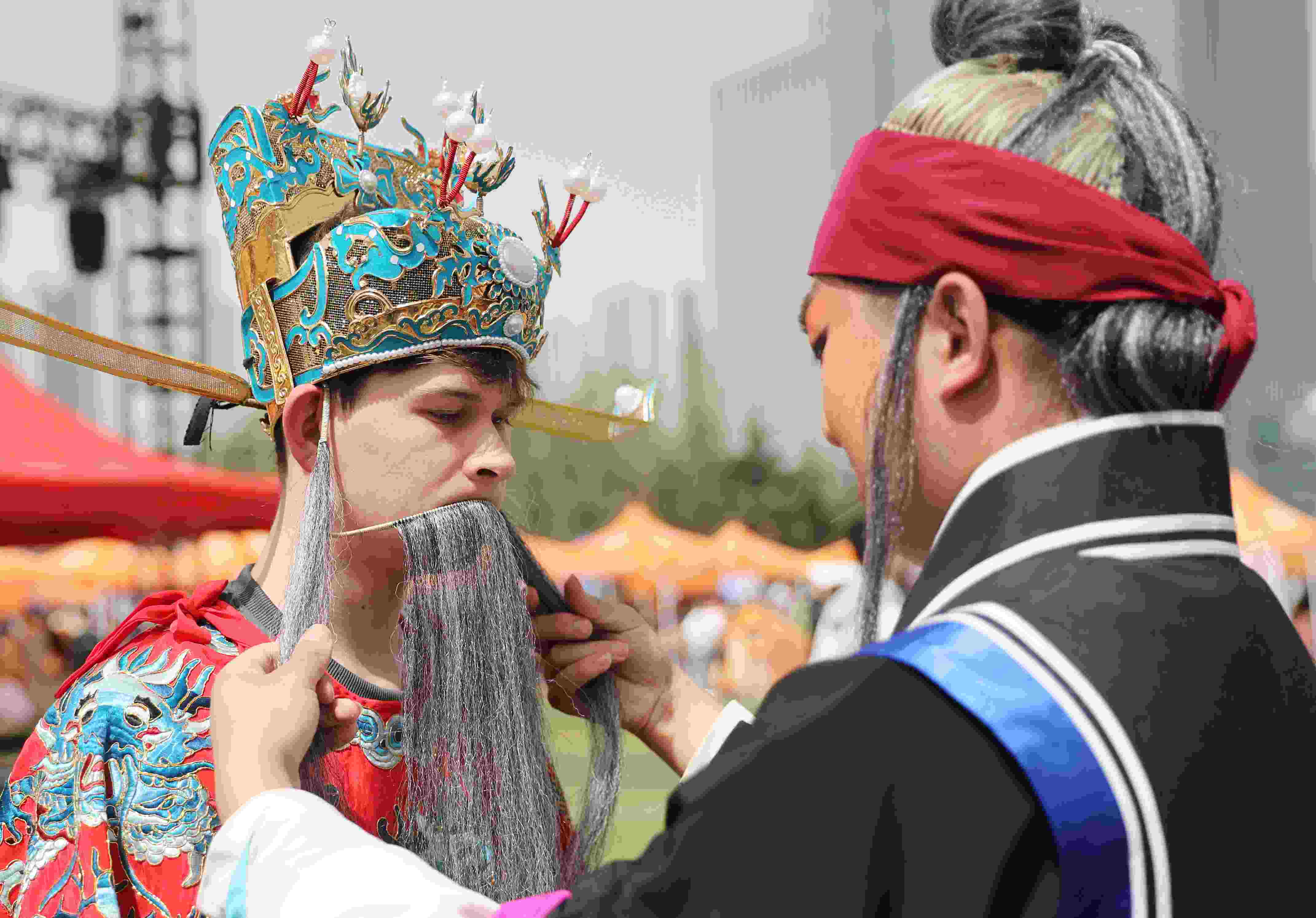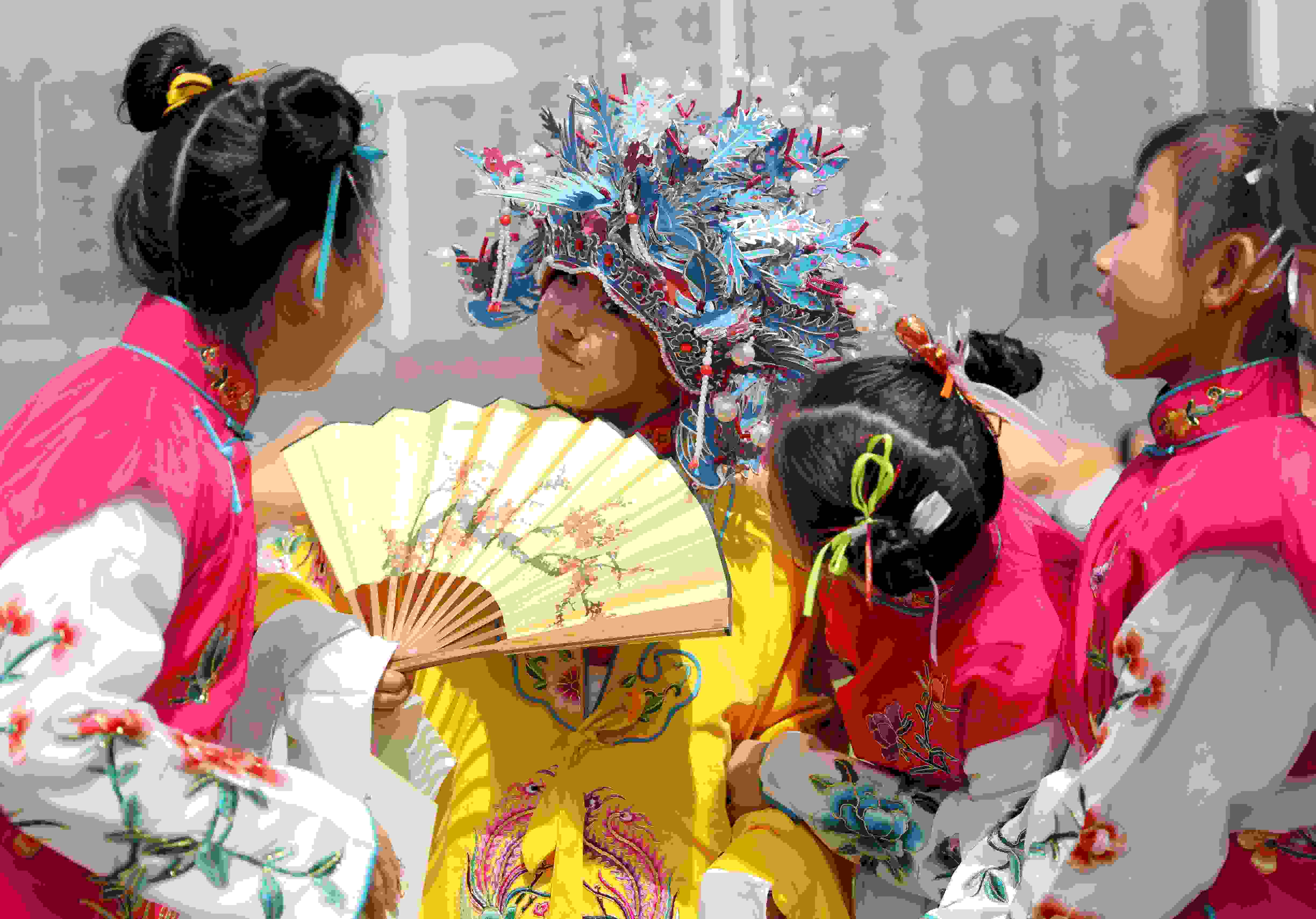 4月15日,山東青島,中國石油大學(華東)韻遠京劇隊的同學們聯(lián)合青島西海岸新區(qū)珠江路小學的小學生們在大學校園里上演了一堂生動的戲曲普及課。