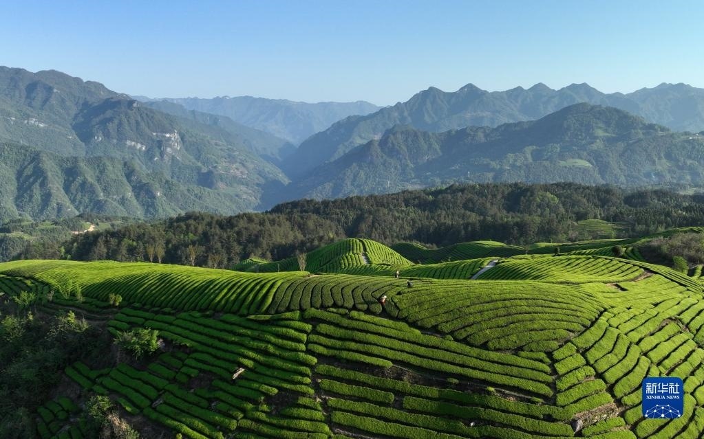 4月16日,茶農(nóng)在鶴峰縣走馬鎮(zhèn)木耳山茶園采茶(無(wú)人機(jī)照片)。   新華社發(fā)(楊順丕攝)