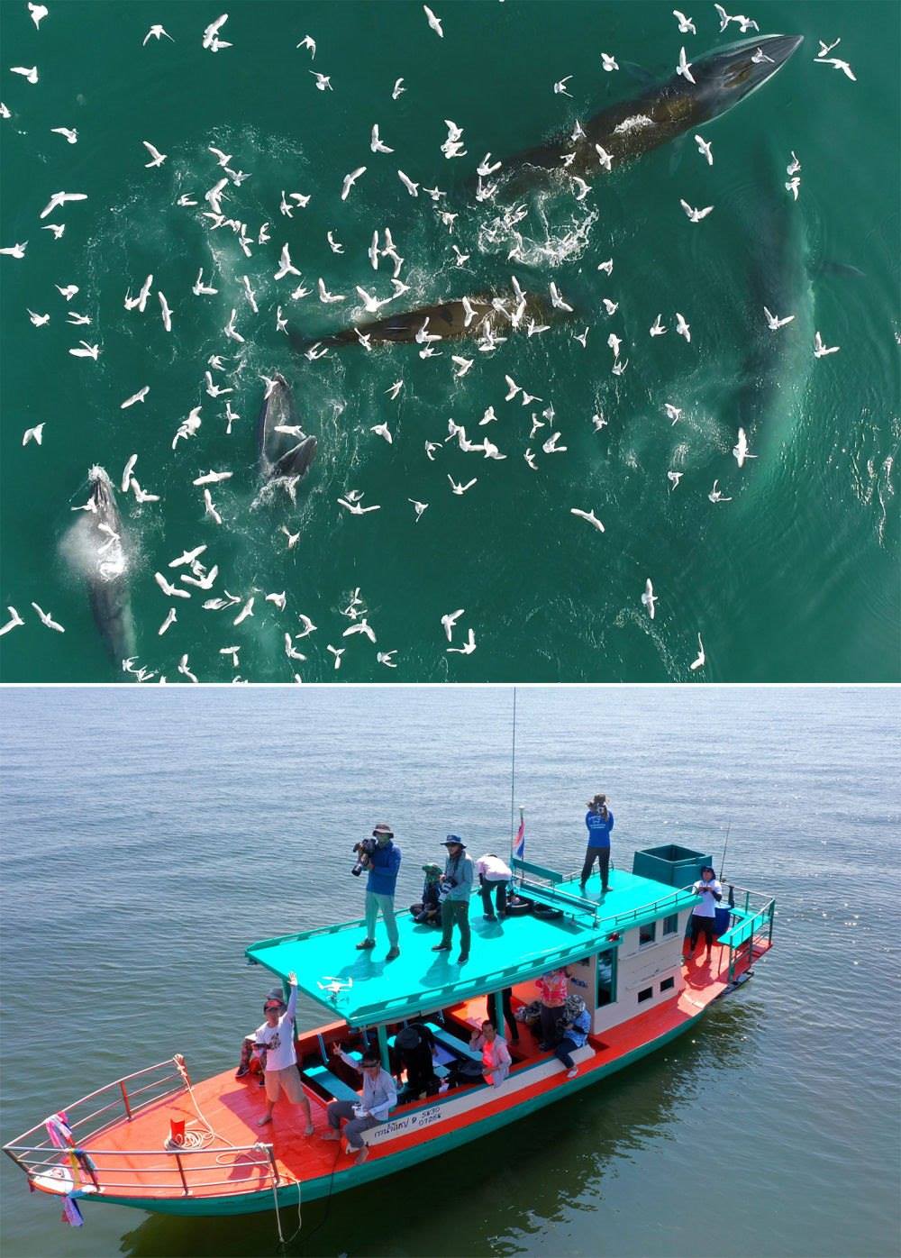 (拼版照片)上圖:布氏鯨在中國廣西潿洲島附近海域捕食(2022年2月22日攝)。下圖:中泰兩國科研人員在泰國灣對布氏鯨進行聯(lián)合調查(2019年10月25日攝)。中泰兩國科研人員攜手研究保護布氏鯨這個近岸大型鯨類,圍繞布氏鯨調查技術、調查方法以及其他海洋哺乳動物的研究和數據處理方法進行交流與合作。