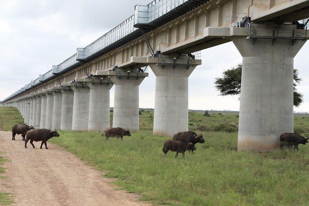 水牛在裝有聲屏障的肯尼亞內羅畢國家公園特大橋下穿行(2021年5月19日攝)。中非共建的肯尼亞內馬鐵路采用特大橋全程穿越內羅畢國家公園方案,橋墩超過6米,讓長頸鹿也能“昂首通過”;特大橋護欄兩側安裝聲屏障,極大降低火車通過時的噪音。