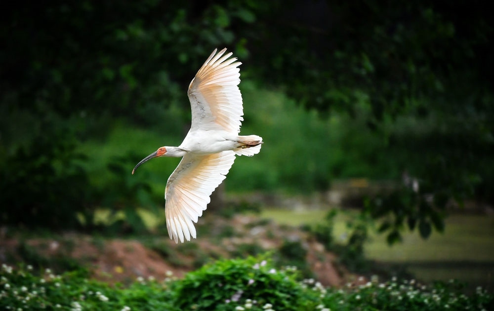 這是陜西省漢中市洋縣朱鹮生態(tài)園內的朱鹮(2021年5月13日攝)。