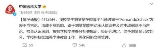 ·在本周中超聯(lián)賽的大連人vs成都蓉城的比賽后,兩隊(duì)的球迷出現(xiàn)了一些沖突。有球迷發(fā)現(xiàn)一名大學(xué)生在網(wǎng)上用5.12地震來攻擊刺激成都球迷,該生所屬中國(guó)醫(yī)科大學(xué)通報(bào),給予其記過處分。