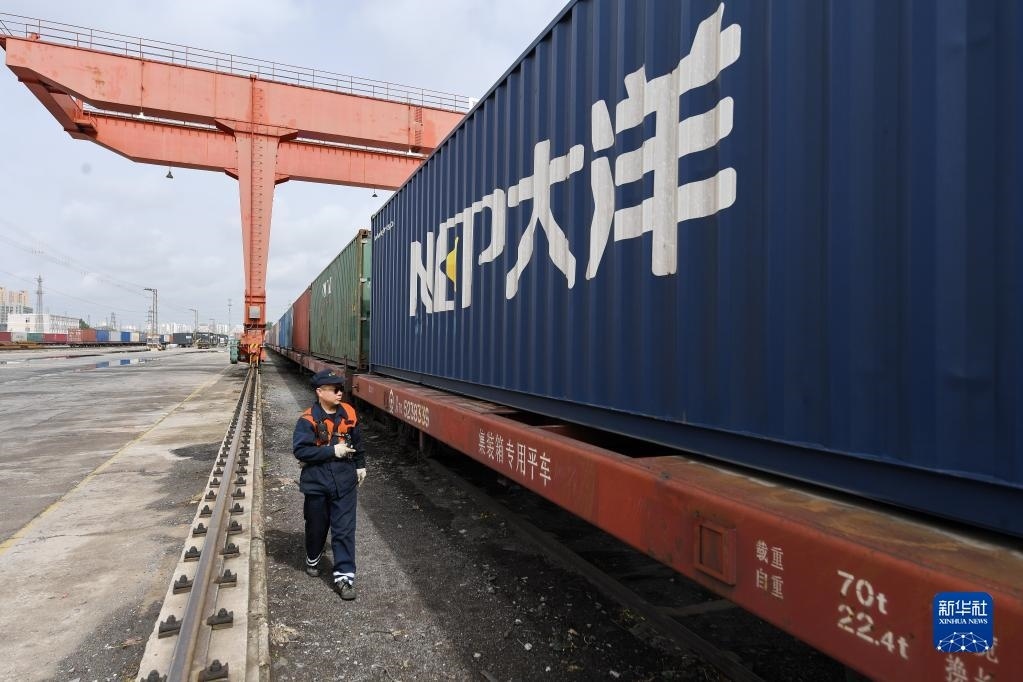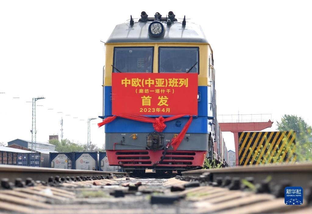 當(dāng)日,河北省廊坊市正式開通中歐(中亞)班列(廊坊——塔什干)。首列開行的集裝箱班列編組55輛,由廊坊北鐵路貨場始發(fā),經(jīng)霍爾果斯口岸出境,途經(jīng)哈薩克斯坦,最終抵達(dá)烏茲別克斯坦塔什干,全程約6000公里,預(yù)計(jì)運(yùn)行時(shí)間約15天,貨物總重量1400余噸,主要包括保溫管、機(jī)械設(shè)備、型材等。新華社發(fā)(劉向攝)