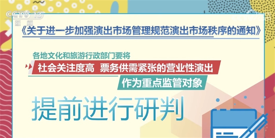 通知指出,各地文化和旅游行政部門要依法做好演出活動的審批工作,將屬于營業(yè)性演出范圍的農(nóng)村集鎮(zhèn)演出、流動性演出納入審批管理,嚴(yán)格審核演出舉辦單位的資質(zhì)文件,統(tǒng)一審批要求,做好內(nèi)容監(jiān)管。對不符合法定審批要求的,堅決不予批準(zhǔn)。文化和旅游行政部門要定期對演出場所進(jìn)行檢查,督促演出場所定期開展設(shè)施設(shè)備檢查,落實安全生產(chǎn)責(zé)任制。督促演出場所建立完善現(xiàn)場巡查制度,指定專人負(fù)責(zé)演出活動的巡查,做好現(xiàn)場觀眾管理,堅決防止擁擠、踩踏等事故發(fā)生,確保演出現(xiàn)場安全。各地文化和旅游行政部門要將社會關(guān)注度高、票務(wù)供需緊張的營業(yè)性演出作為重點監(jiān)管對象,提前進(jìn)行研判。督促演出舉辦單位、演出票務(wù)經(jīng)營單位面向市場公開銷售的營業(yè)性演出門票數(shù)量,不得低于核準(zhǔn)觀眾數(shù)量的70%。對在票務(wù)經(jīng)營中發(fā)現(xiàn)有炒票問題或可能造成不良影響的,應(yīng)當(dāng)及時約談演出舉辦單位和演出票務(wù)經(jīng)營單位,督促整改。要聯(lián)合屬地公安、市場監(jiān)管等部門,依法打擊“黃?!背雌?、虛假宣傳等違法違規(guī)行為,切實保障消費者合法權(quán)益。