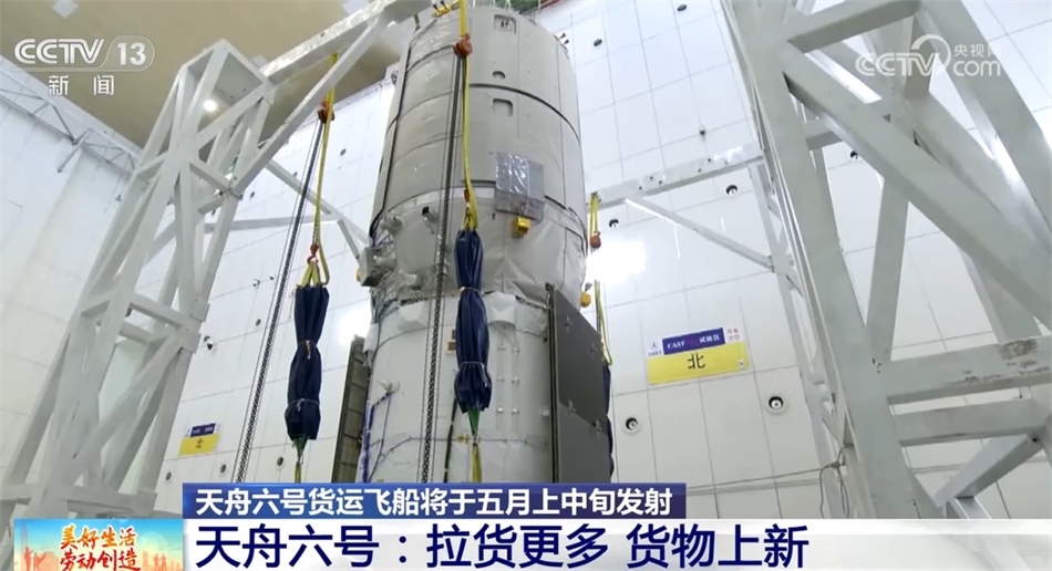 總臺(tái)央視記者 陶嘉樹(shù):在我身后的就是天舟貨運(yùn)飛船,它整個(gè)的長(zhǎng)度是10.6米,整體分成兩個(gè)部分,下面比較小的這一部分是它的推進(jìn)艙,上面比較大的部分是它的貨物艙。天舟貨運(yùn)飛船總重13.5噸,從天舟六號(hào)開(kāi)始,它的載貨量從以前的6.9噸提高到了7.4噸,是目前世界上運(yùn)貨能力最強(qiáng)的貨運(yùn)飛船之一。