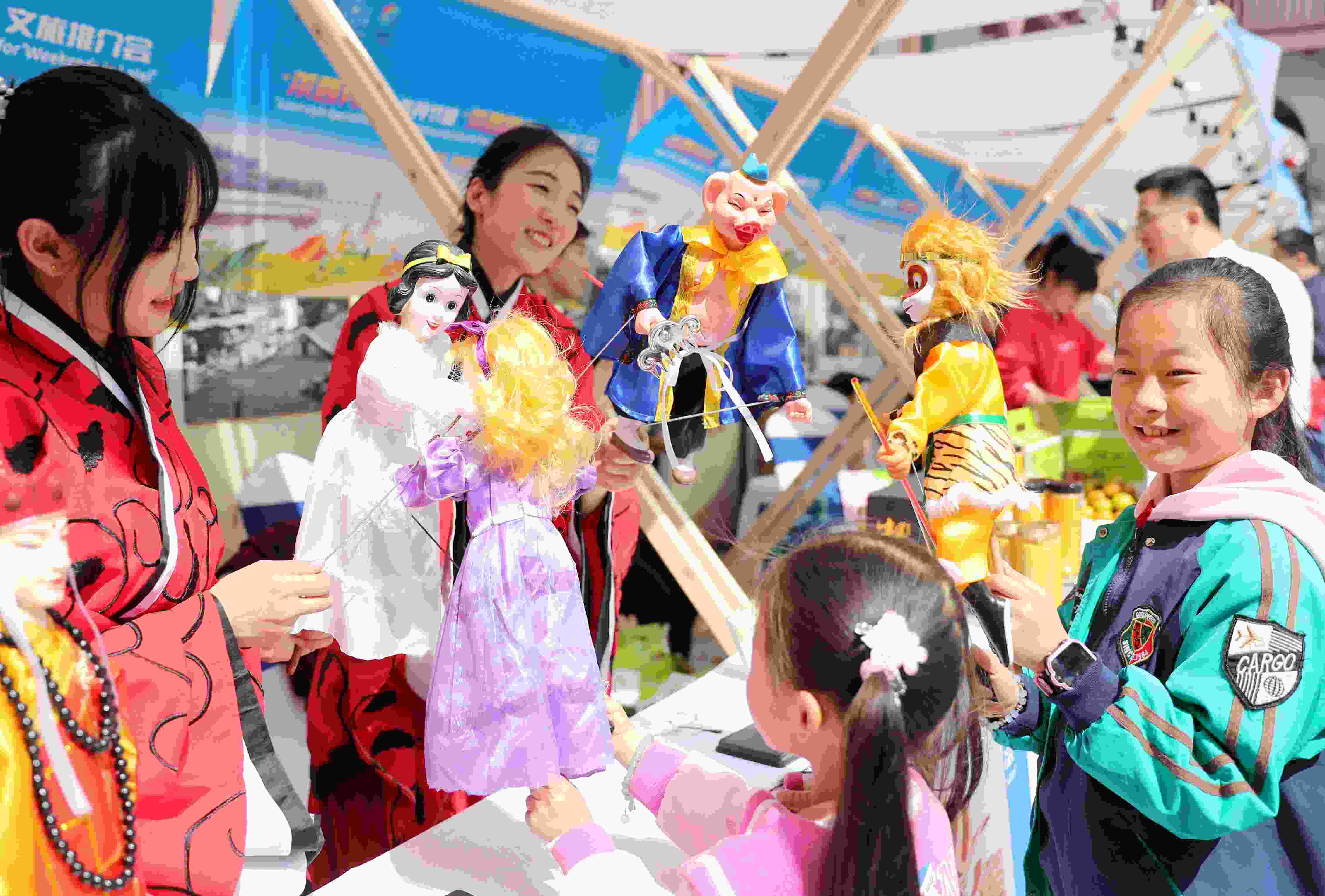 4月30日,山東萊西木偶藝術團的演員在給游人們展示木偶戲的表演技巧。 張進剛 攝