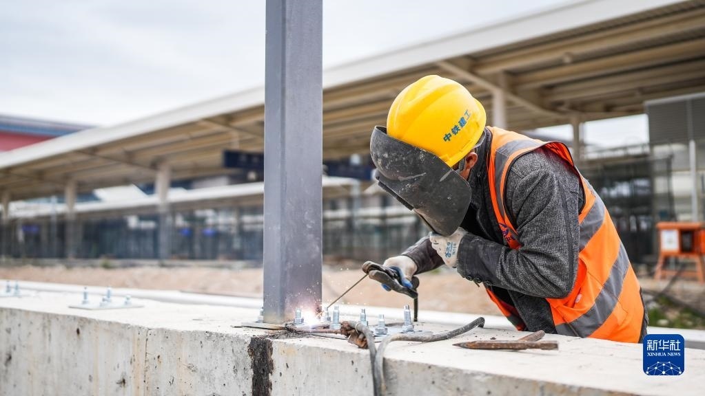 5月1日,中鐵建工集團工人在貴州貴安新區(qū)貴安站擴建項目工地施工。   新華社記者 陶亮 攝