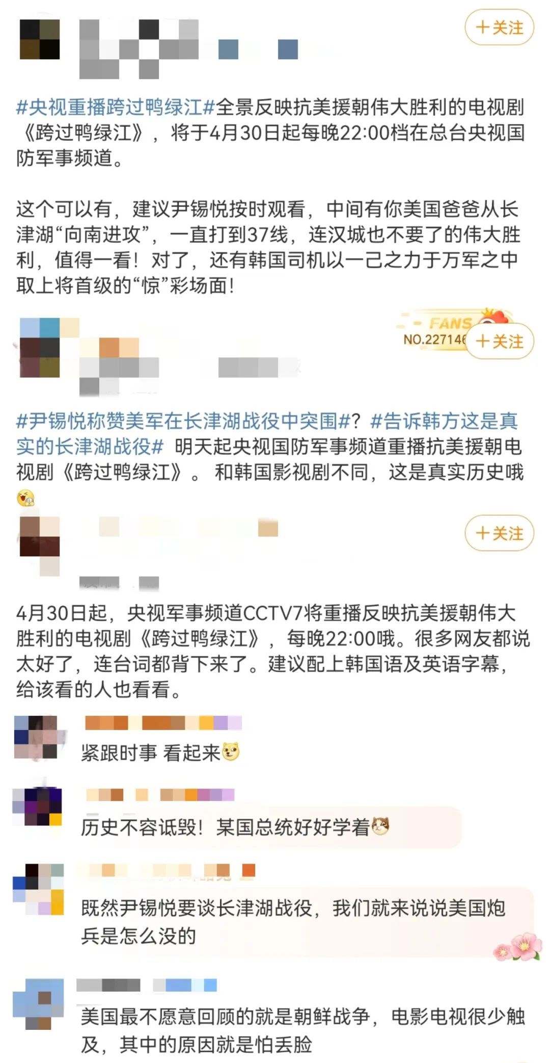 新加坡《聯(lián)合早報(bào)》更在4月30日晚10點(diǎn)準(zhǔn)時(shí)發(fā)布文章《電視劇<跨過(guò)鴨綠江>將在中國(guó)央視重播》,開(kāi)篇明確重點(diǎn):在韓國(guó)總統(tǒng)稱贊美國(guó)海軍陸戰(zhàn)隊(duì)第一師在長(zhǎng)津湖戰(zhàn)役中的表現(xiàn)后,中國(guó)央視稱將從星期天(4月30日)起重播電視劇《跨過(guò)鴨綠江》。