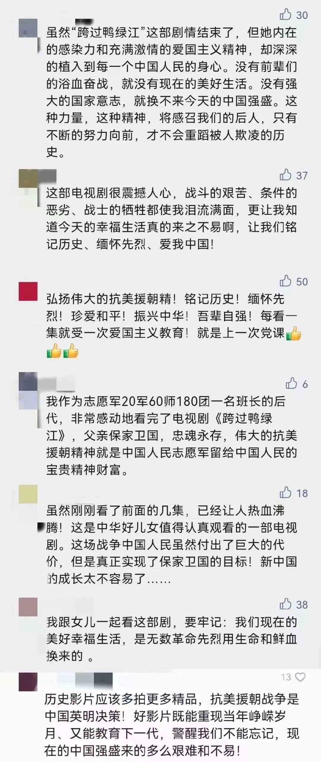 “抗美援朝絕對(duì)是值得紀(jì)念和謳歌的奇跡!這部電視劇是一部愛(ài)國(guó)主義教育的活教材!”這是網(wǎng)友對(duì)這部劇的評(píng)價(jià)。