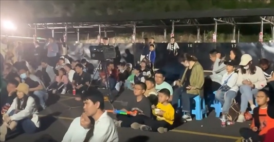 ·河南焦作一景區(qū)為游客放露天電影、送方便面,工作人員:客流大,緩解他們的情緒。
