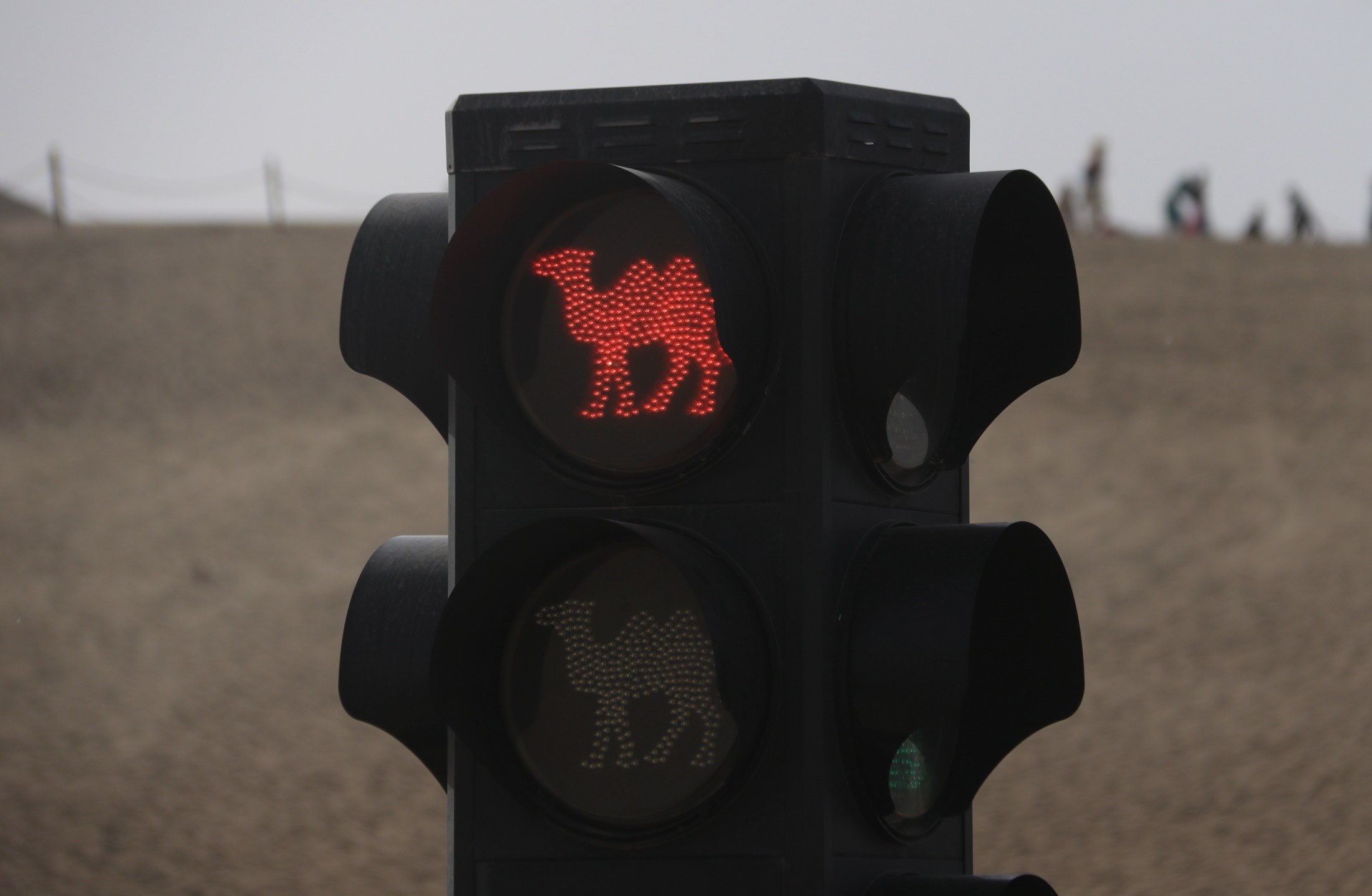 2023年5月1日,甘肅酒泉,敦煌市鳴沙山月牙泉景區(qū),具有駱駝元素的交通信號燈。
