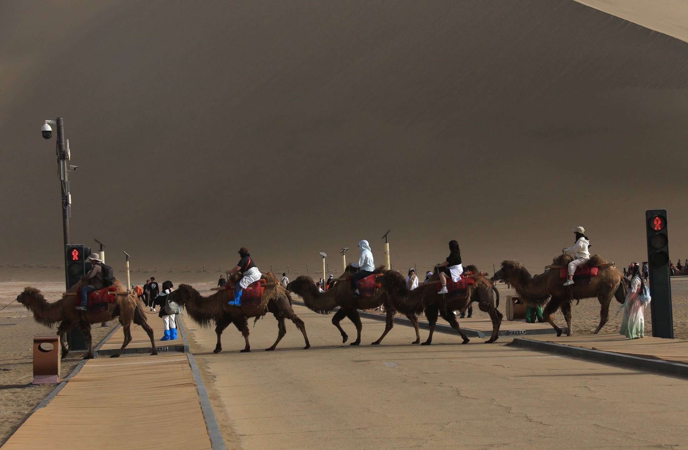 “五一”假期,甘肅省敦煌市鳴沙山月牙泉景區(qū)迎來旅游高峰。設置在該景區(qū)內行人步道和駱駝通道兩個交叉點的“駱駝紅綠燈”,引導人、車和駱駝有序分流,不僅確保了景區(qū)交通安全暢通,也成為景區(qū)內的“網(wǎng)紅打卡點”之一 。