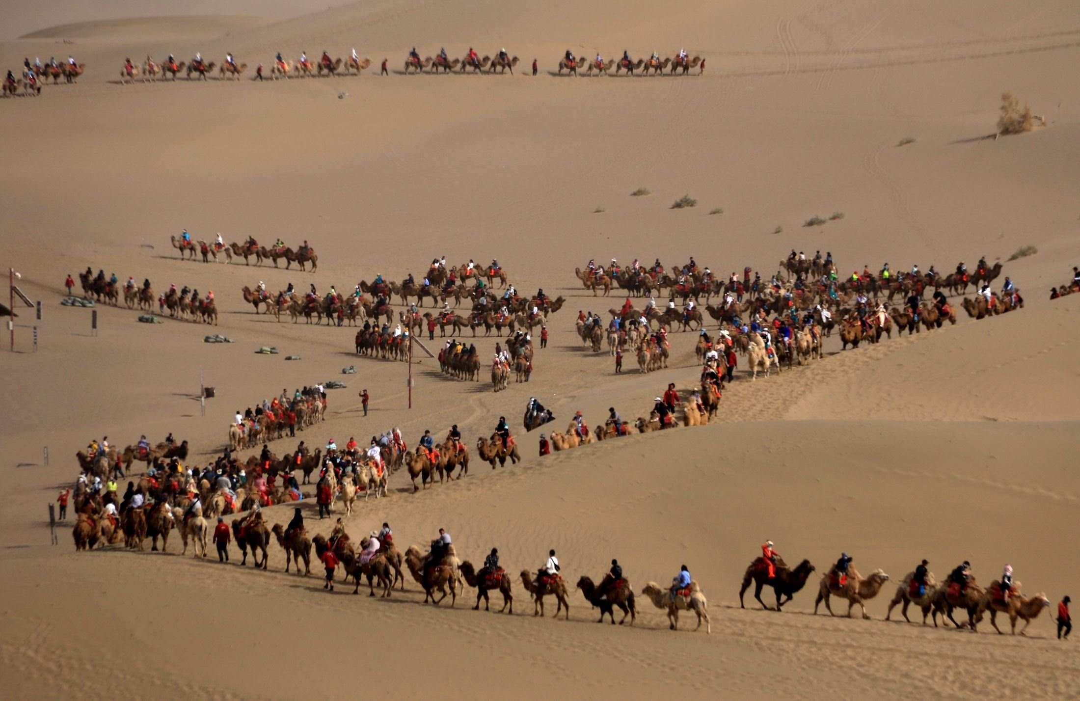 2023年5月1日,甘肅酒泉,敦煌市鳴沙山月牙泉景區(qū),“駱駝紅綠燈”亮起,農戶牽著駱駝有序通過。