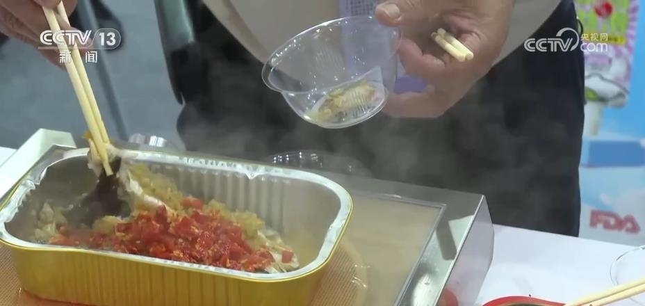 最受歡迎的莫過于預(yù)制菜的展位,熱辣的川菜、清淡的粵菜、精致的中式點心,還有各地的特色小吃,各種菜品應(yīng)有盡有。一加熱,香氣四溢,引來不少外國客商試吃。