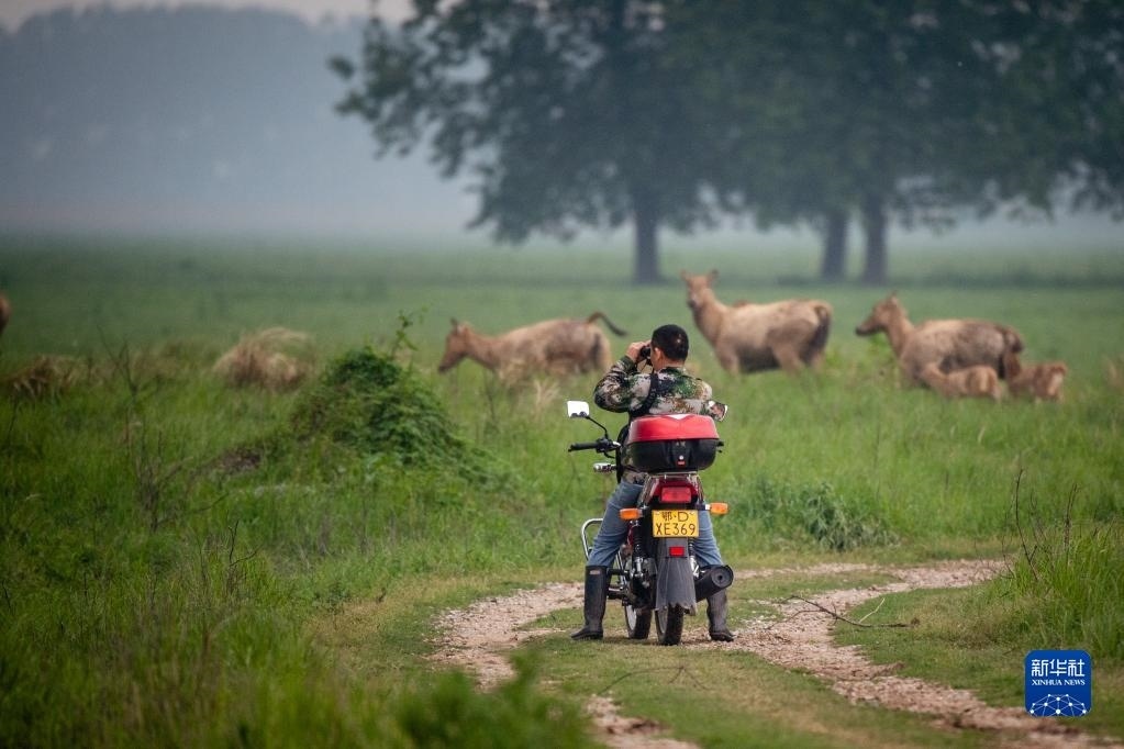 4月28日,在石首麋鹿國家級自然保護區(qū),巡護員劉吉高觀測遠處的一群麋鹿。