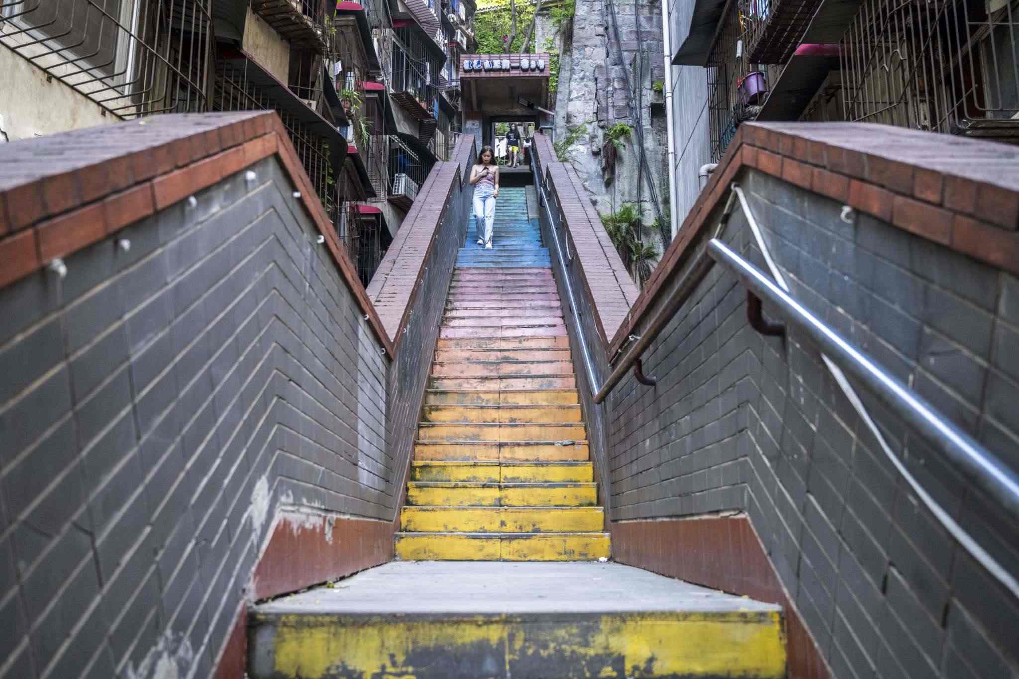 “彩虹樓梯”位于重慶渝中區(qū)枇杷山正街的居民樓間,高約20米,共有50多級(jí)階梯,極具山城特色。經(jīng)過多種顏色涂鴉后,吸引不少市民和攝影愛好者“打卡”。視覺中國