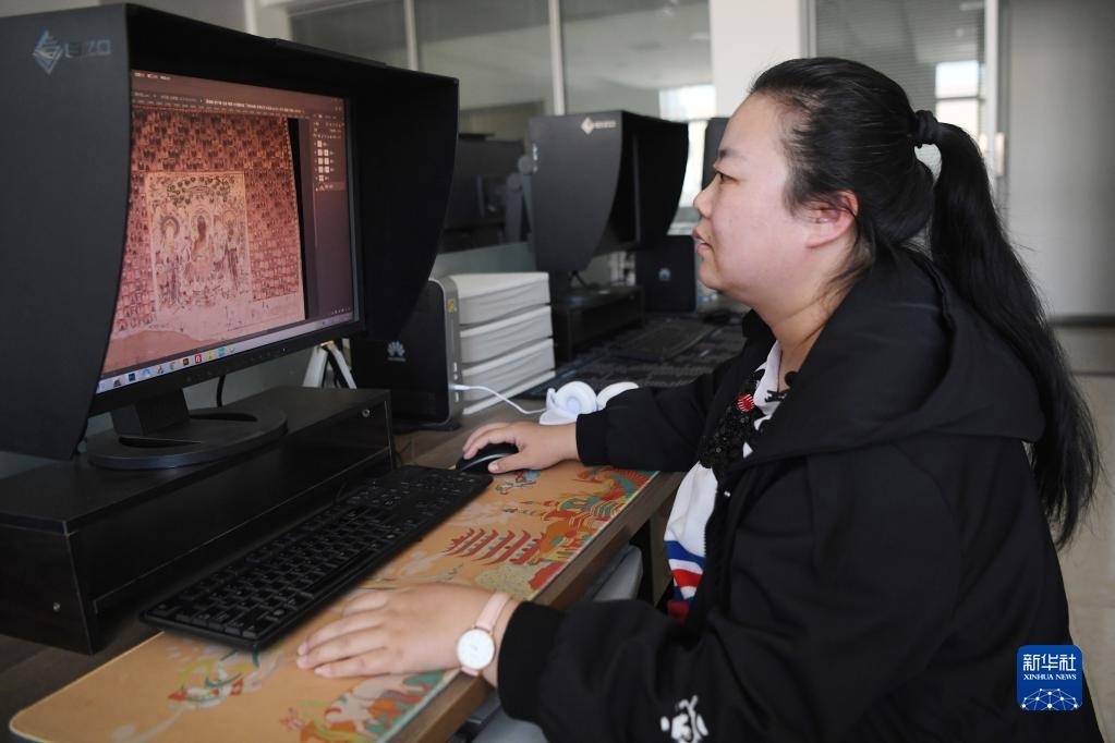 敦煌研究院文物數(shù)字化保護(hù)團(tuán)隊(duì)圖像處理人員年海麗在拼接壁畫(huà)圖像(4月25日攝)。