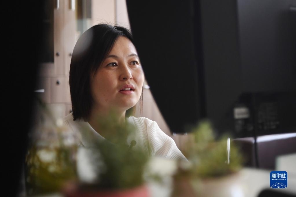敦煌研究院文物數(shù)字化保護(hù)團(tuán)隊(duì)圖像處理人員年海麗從莫高窟照片墻前走過(guò)(4月25日攝)。