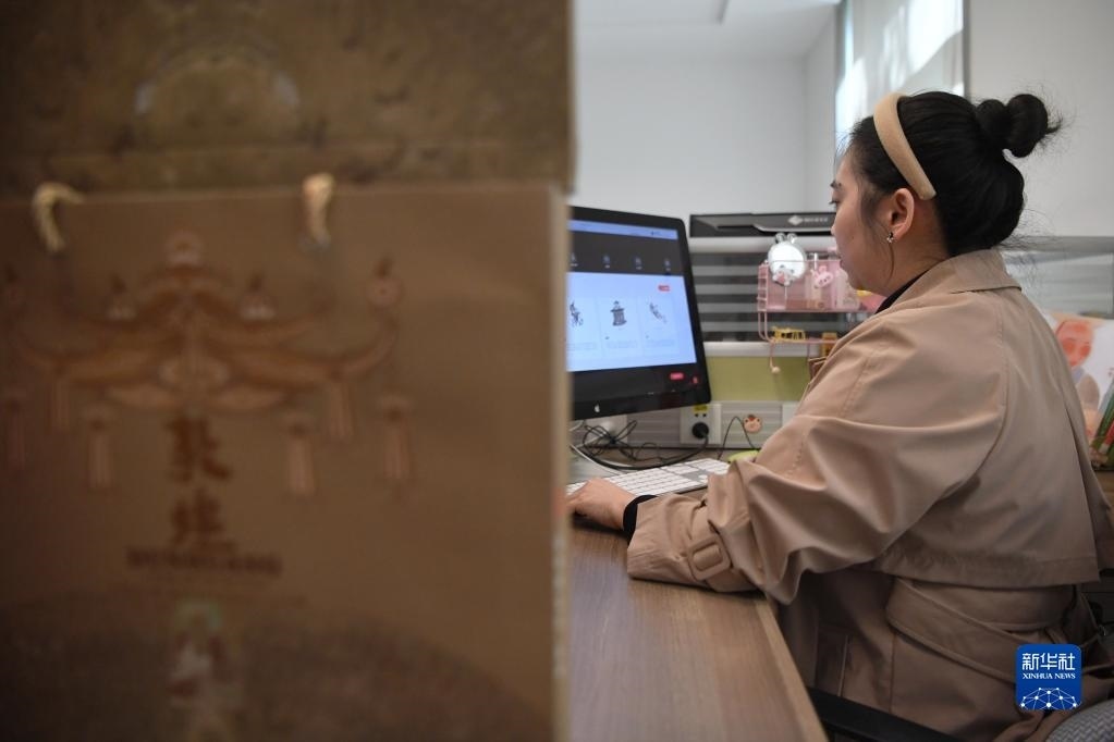 敦煌研究院文物數(shù)字化保護(hù)團(tuán)隊(duì)創(chuàng)意營(yíng)銷(xiāo)人員廖雪婷在整理文創(chuàng)產(chǎn)品(4月25日攝)。