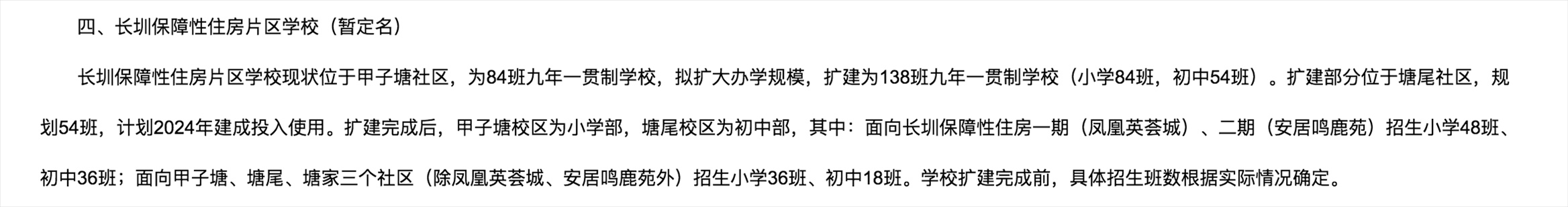根據(jù)最新的學(xué)區(qū)劃分方案,長(zhǎng)圳保障性住房片區(qū)學(xué)校現(xiàn)狀位于甲子塘社區(qū),為84班九年一貫制學(xué)校,擬擴(kuò)大辦學(xué)規(guī)模,擴(kuò)建為138班九年一貫制學(xué)校(小學(xué)84班,初中54班)。擴(kuò)建部分位于塘尾社區(qū),規(guī)劃54班,計(jì)劃2024年建成投入使用。擴(kuò)建完成后,甲子塘校區(qū)為小學(xué)部,塘尾校區(qū)為初中部,其中:面向長(zhǎng)圳保障性住房一期(鳳凰英薈城)、二期(安居鳴鹿苑)招生小學(xué)48班、初中36班;面向甲子塘、塘尾、塘家三個(gè)社區(qū)(除鳳凰英薈城、安居鳴鹿苑外)招生小學(xué)36班、初中18班。