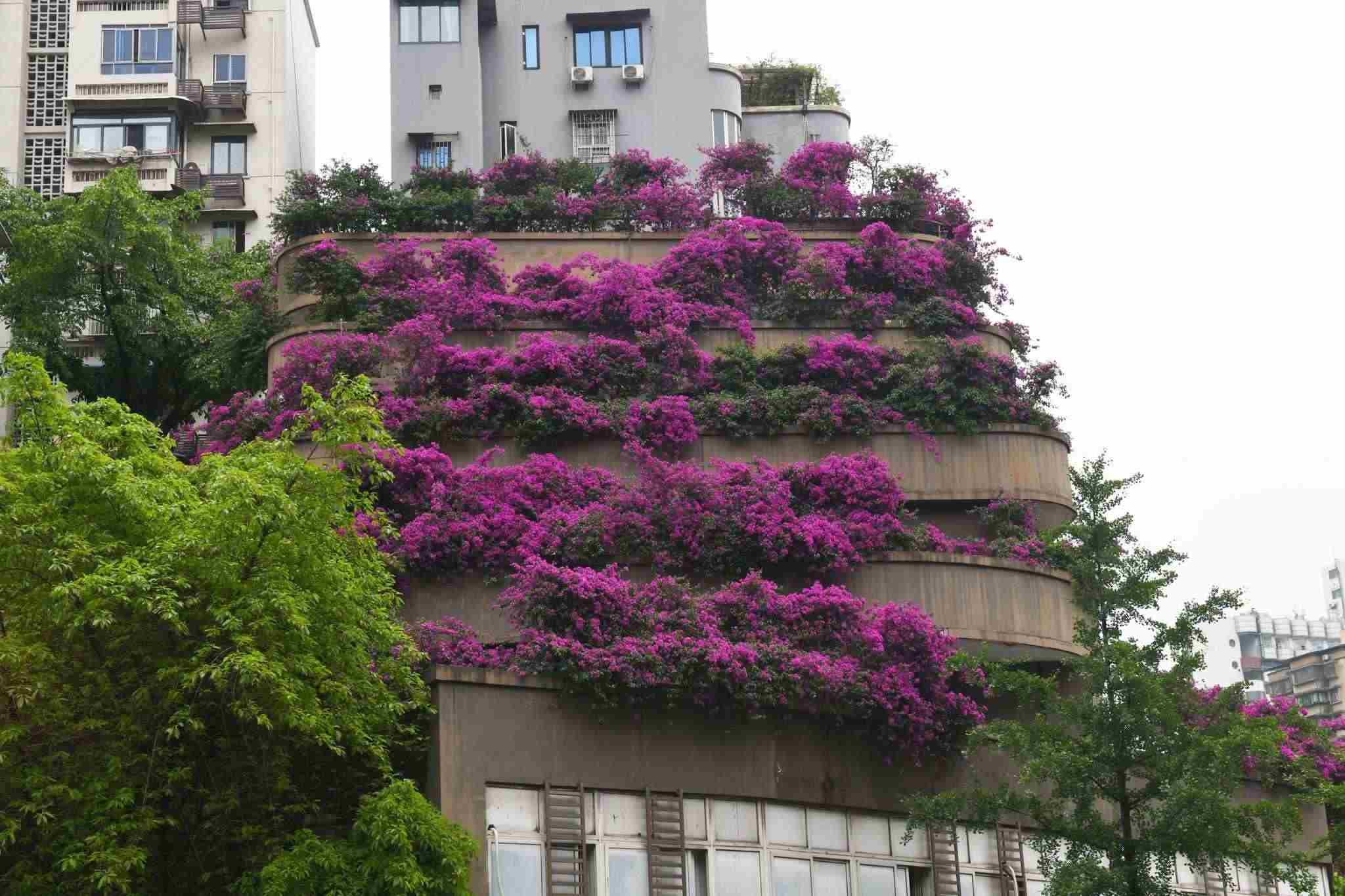 2023年5月5日,重慶,渝中區(qū)上清寺一建筑被盛開的三角梅層層環(huán)繞,仿佛穿上了一件“花衣”。視覺中國