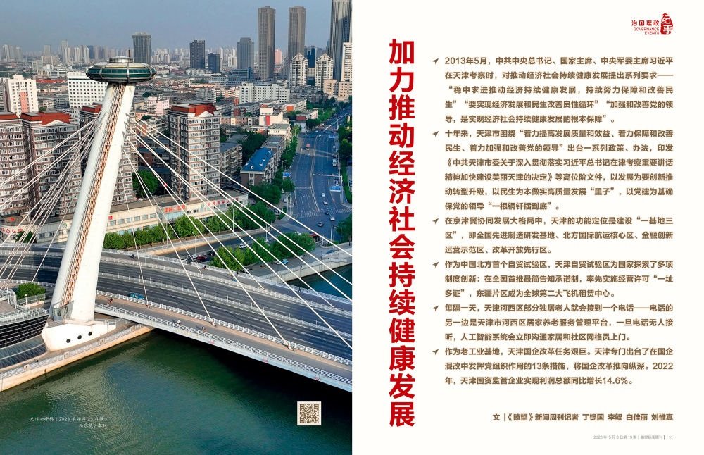 時光回到十年前。2013年5月,中共中央總書記、國家主席、中央軍委主席習(xí)近平在天津考察時,對推動經(jīng)濟(jì)社會持續(xù)健康發(fā)展提出系列要求——“穩(wěn)中求進(jìn)推動經(jīng)濟(jì)持續(xù)健康發(fā)展,持續(xù)努力保障和改善民生”“要實現(xiàn)經(jīng)濟(jì)發(fā)展和民生改善良性循環(huán)”“加強和改善黨的領(lǐng)導(dǎo),是實現(xiàn)經(jīng)濟(jì)社會持續(xù)健康發(fā)展的根本保障”。