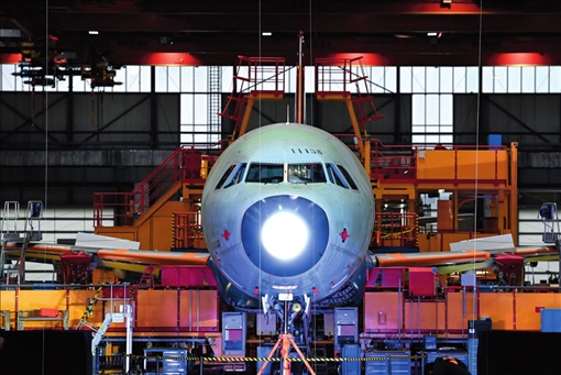 空客天津總裝線的首架空客 A321 飛機(jī)上線開始總裝(2022 年 11 月 9 日攝)趙子碩攝 / 本刊