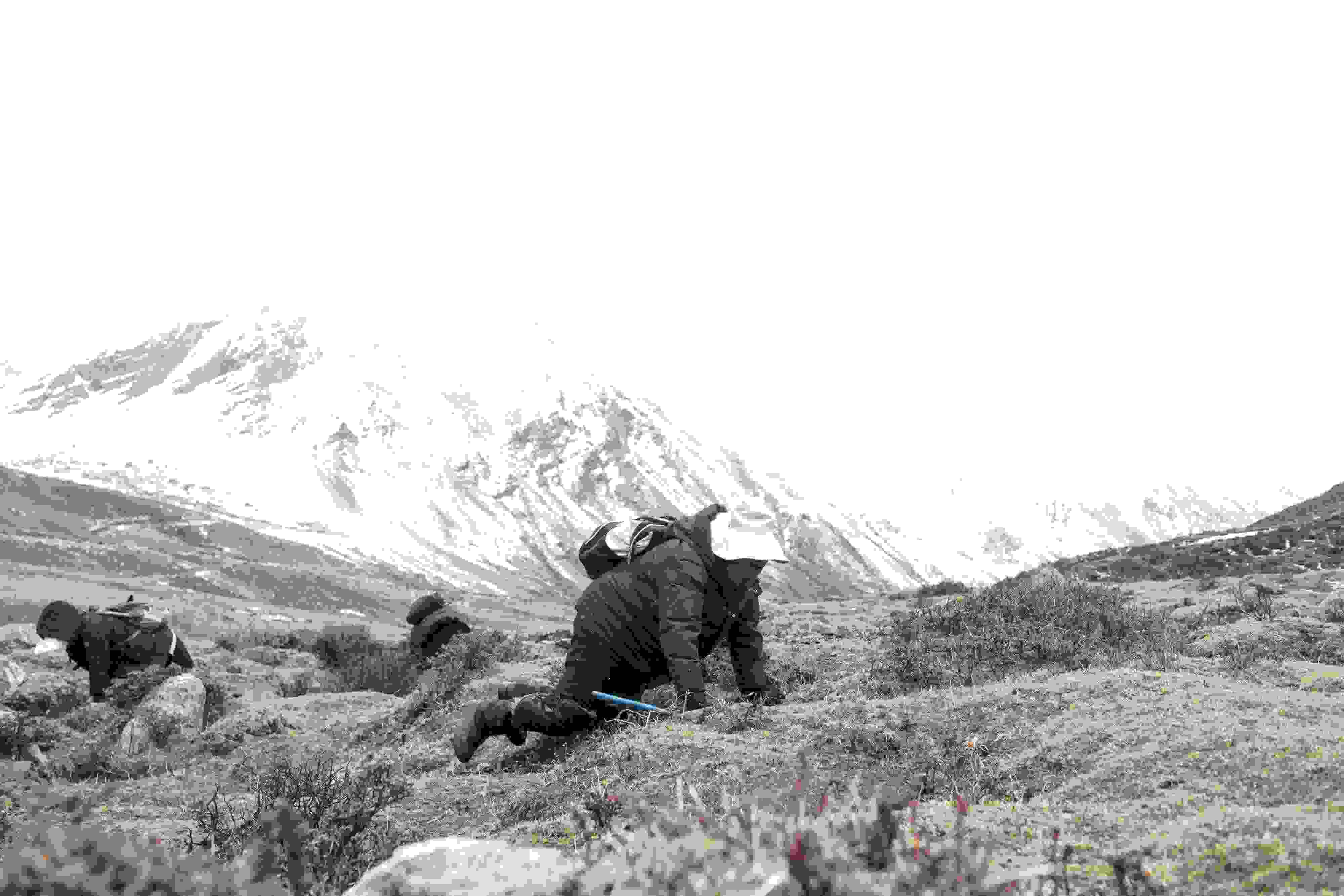 2023年5月7日,西藏山南,加查縣安繞鎮(zhèn)的村民在索囊溝采挖冬蟲夏草。 視覺中國