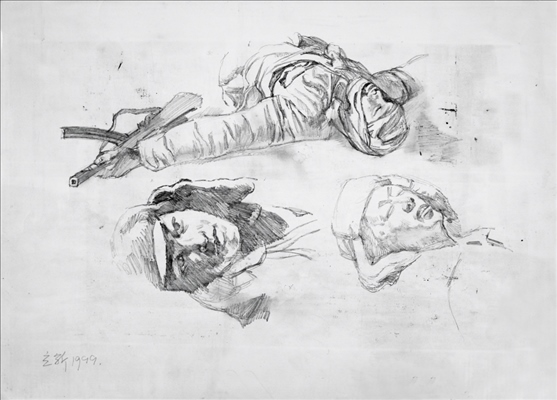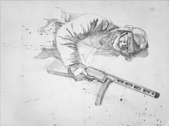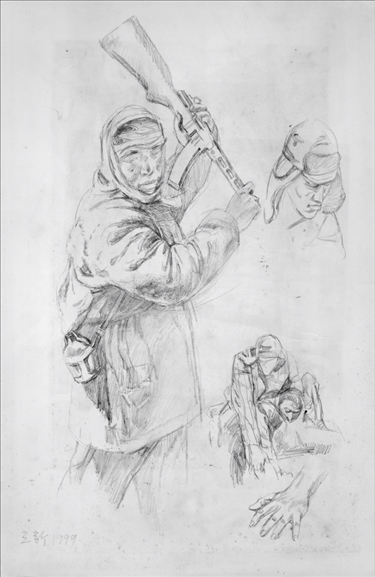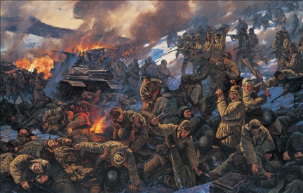 《激戰(zhàn)松骨峰》描繪的是抗美援朝戰(zhàn)爭中,中國人民志愿軍與美軍激烈廝殺的悲壯場面。作者從動態(tài)型的構(gòu)圖與形象表層,把戰(zhàn)爭集團之間的搏殺以濃重的筆調(diào)展現(xiàn)開來,表現(xiàn)了中國人民志愿軍英勇頑強、熱愛自由和勇于犧牲的精神,展示了歷史的悲劇性沖突。作者從沉甸甸的歷史中找到戰(zhàn)爭中最慘烈、最殘酷、最能表現(xiàn)人物悲劇性命運的瞬間,用現(xiàn)實主義的創(chuàng)作手法,扎實、生動地塑造了一個又一個志愿軍勇士的形象。硝煙籠罩著戰(zhàn)場,鮮血與白雪融合成冰,敵我雙方,犬牙交錯,生死搏殺。同時,也使我們感受到戰(zhàn)爭的殘酷與生命的脆弱。作者處理宏大的戰(zhàn)爭場面獨具匠心:陽光透過硝煙,有節(jié)奏地營造出戰(zhàn)場的空間;雪地上被間隔的藍色陰影,反襯出黃褐色的主調(diào)。作品對細部進行了恰如其分的刻畫,但又不失對整體宏觀的把握,厚重的色彩中透出熱情,樸拙的筆觸映著畫家的激動。