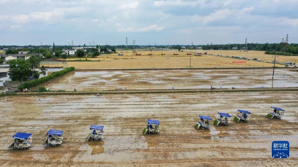 5月10日,在四川省崇州市天府糧倉國家現(xiàn)代農(nóng)業(yè)園區(qū),農(nóng)民駕駛農(nóng)機(jī)搶種水稻(無人機(jī)照片)。   新華社記者 王曦 攝