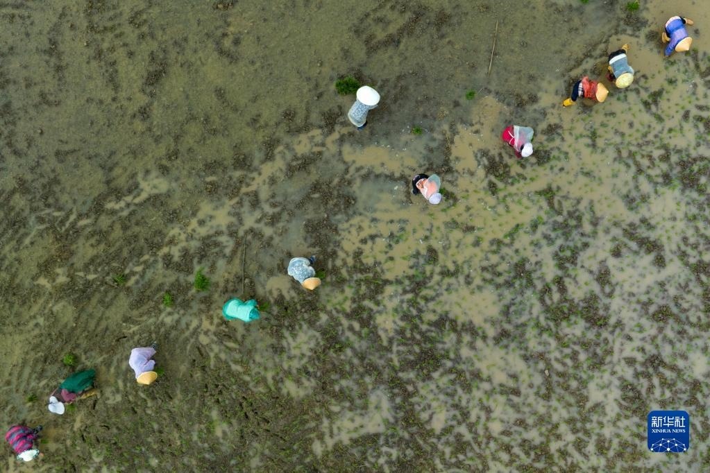 5月9日,在四川省崇州市道明鎮(zhèn)協(xié)和社區(qū),農(nóng)民在一片高標(biāo)準(zhǔn)農(nóng)田里種植水稻(無人機(jī)照片)。   新華社記者 沈伯韓 攝