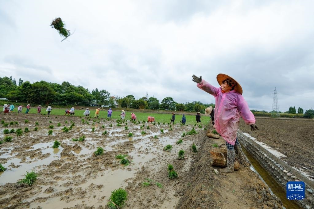5月9日,在四川省崇州市道明鎮(zhèn)協(xié)和社區(qū),農(nóng)民向一片高標(biāo)準(zhǔn)農(nóng)田里拋水稻秧苗,以方便其他農(nóng)民插秧。   新華社記者 沈伯韓 攝
