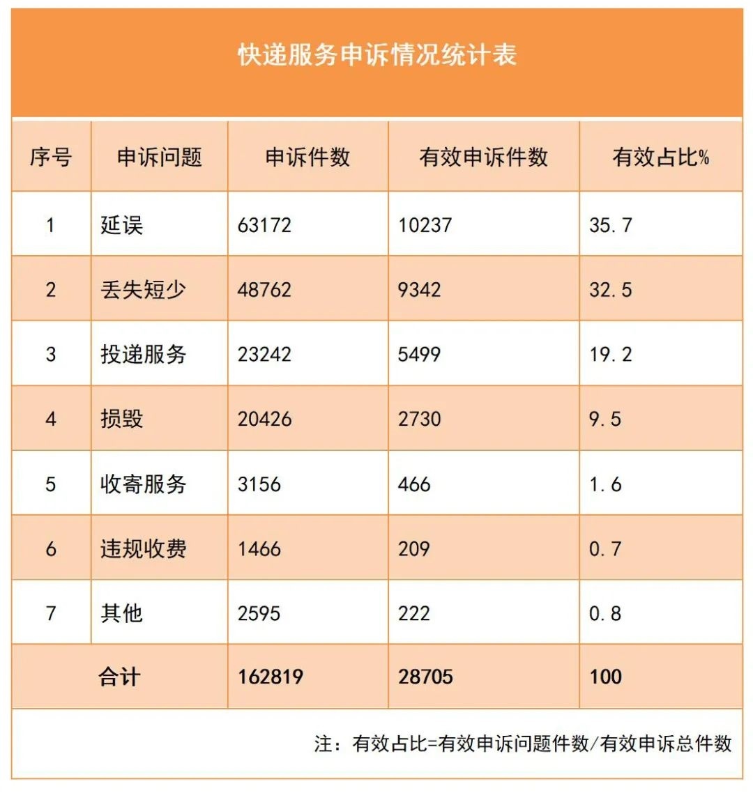 1.快遞服務(wù)申訴問(wèn)題數(shù)量與類(lèi)別情況。用戶對(duì)快遞服務(wù)問(wèn)題申訴162819件,其中有效申訴28705件,涉及的主要問(wèn)題依次是快件延誤、快件丟失短少和投遞服務(wù),分別占有效申訴總量的35.7%、32.5%和19.2%。