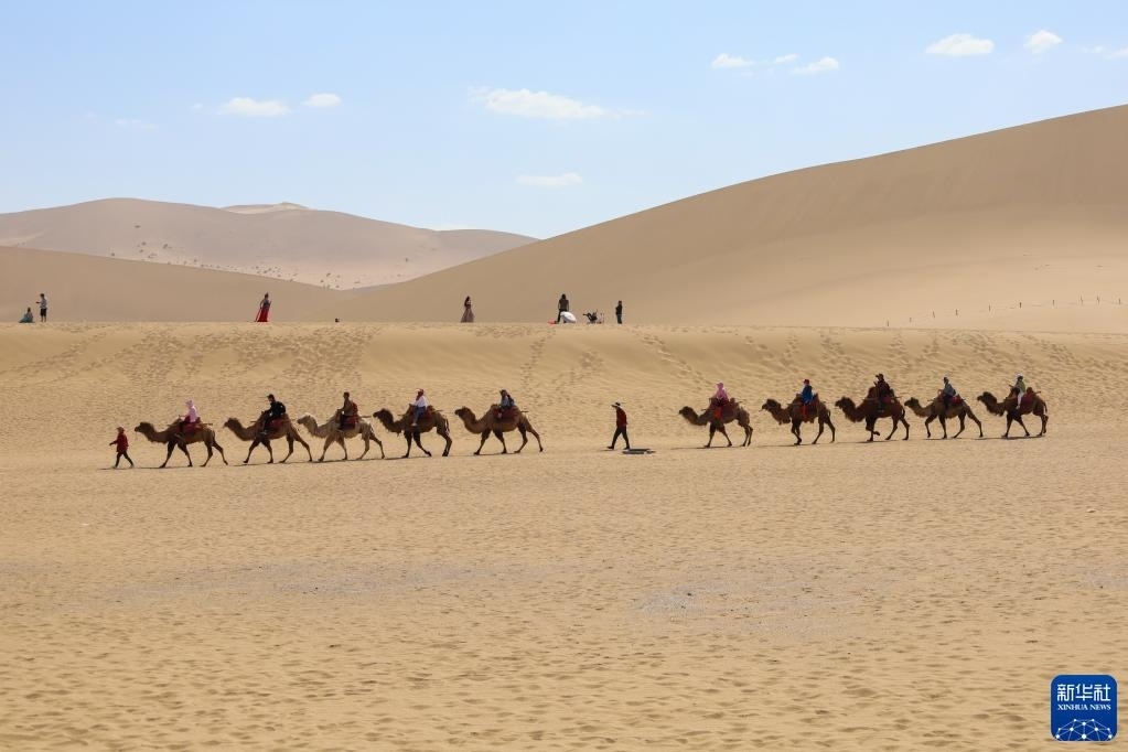 5月11日,游客在鳴沙山月牙泉景區(qū)騎駱駝?dòng)^光。