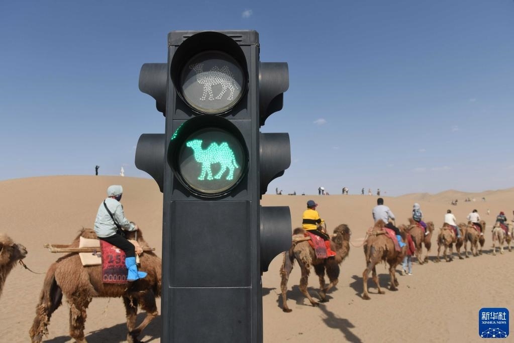 5月11日,在鳴沙山月牙泉景區(qū),游客乘坐的駱駝隊(duì)根據(jù)“駱駝紅綠燈”有序通過路口。