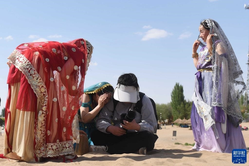 5月11日,游客在鳴沙山月牙泉景區(qū)體驗(yàn)旅拍項(xiàng)目。