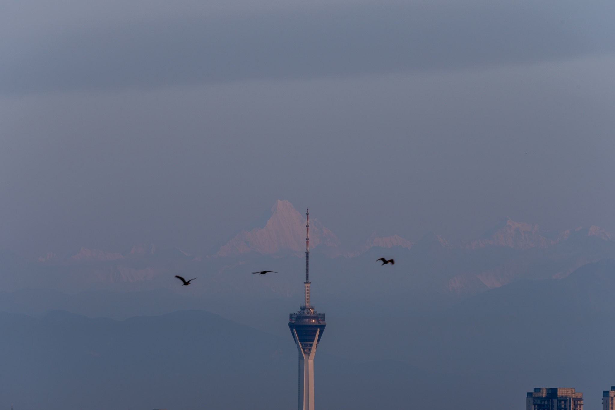 2023年5月13日,成都,幺妹峰露出真容,與城市建筑同框。視覺中國
