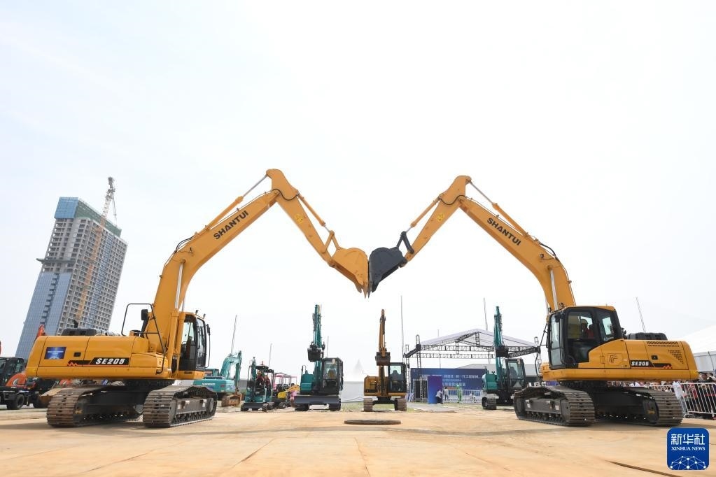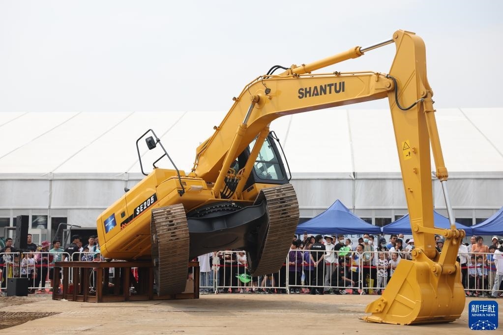 5月13日,在長(zhǎng)沙國(guó)際工程機(jī)械展覽會(huì)上,機(jī)手駕駛挖掘機(jī)“比心”。