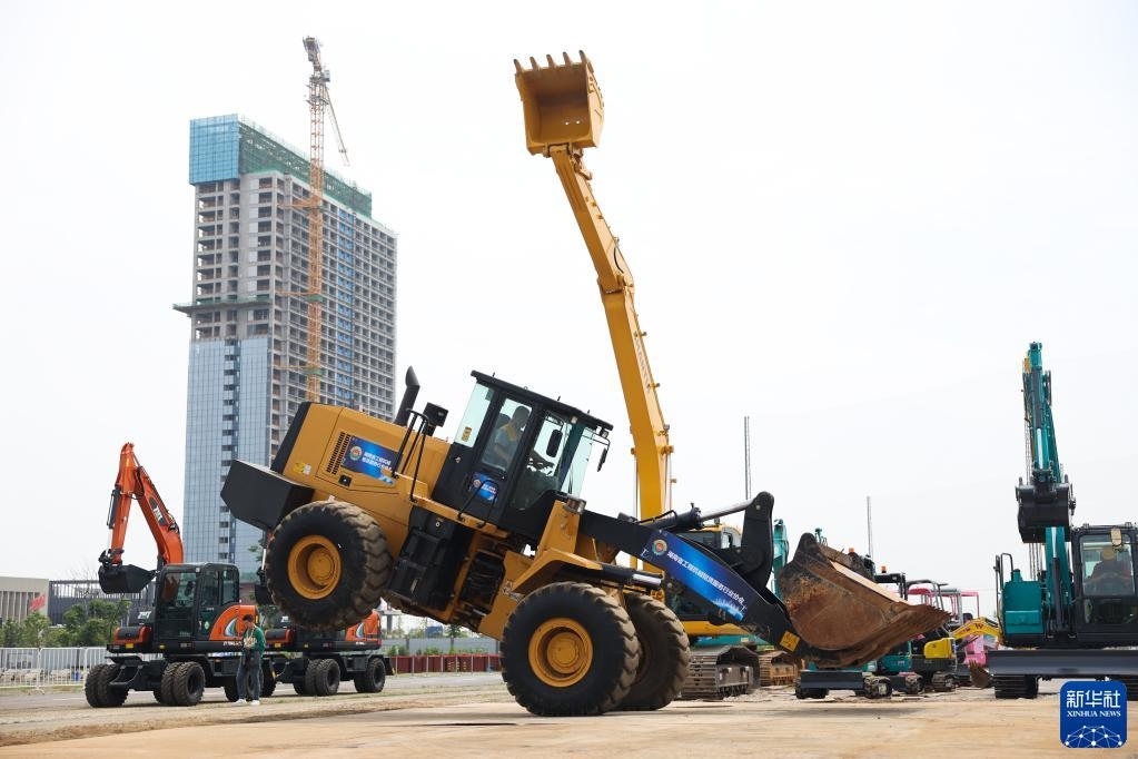 5月13日,在長(zhǎng)沙國(guó)際工程機(jī)械展覽會(huì)上,機(jī)手駕駛裝載機(jī)表演。