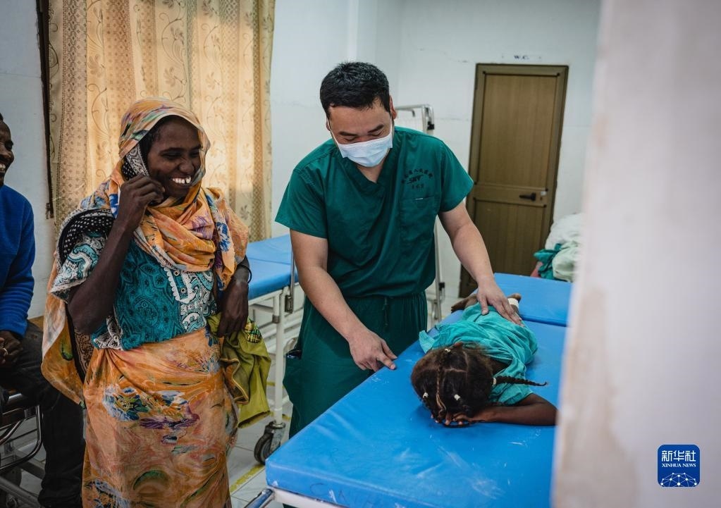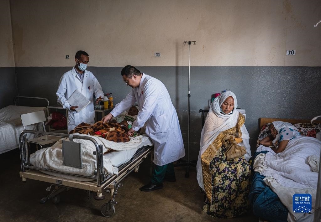5月9日,在厄立特里亞首都阿斯馬拉的哈利貝特醫(yī)院,醫(yī)療隊(duì)普外科醫(yī)生邢宏彬(中)為患者做檢查。