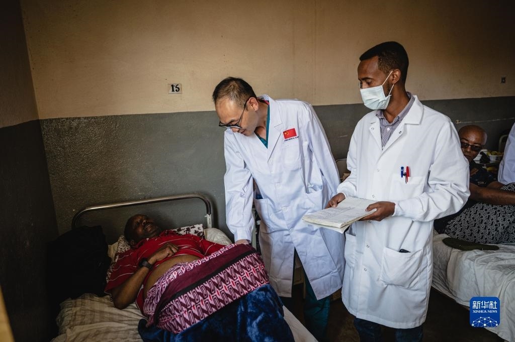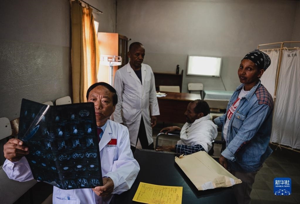 5月9日,在厄立特里亞首都阿斯馬拉的哈利貝特醫(yī)院,醫(yī)療隊(duì)隊(duì)長(zhǎng)、脊柱外科醫(yī)生朱振軍(前)為患者做檢查。