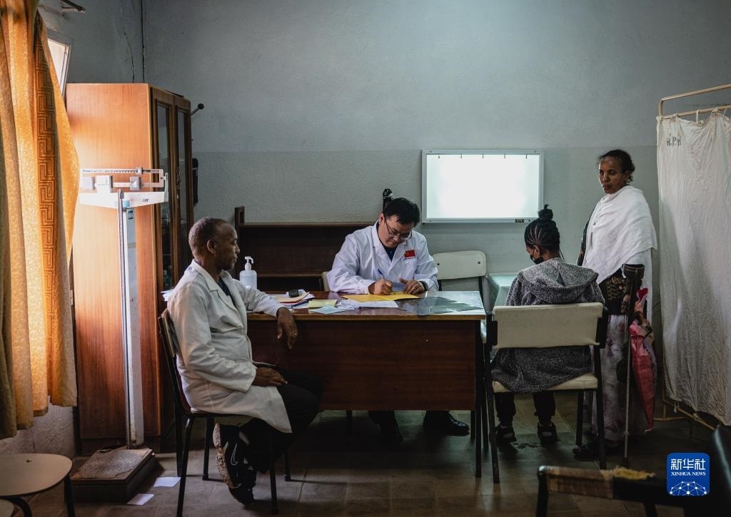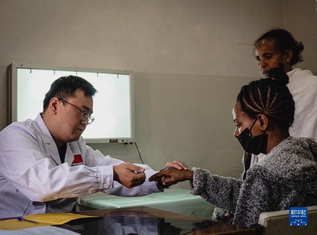 5月9日,在厄立特里亞首都阿斯馬拉的哈利貝特醫(yī)院,醫(yī)療隊(duì)脊柱外科醫(yī)生周大凱(左)為患者做檢查。