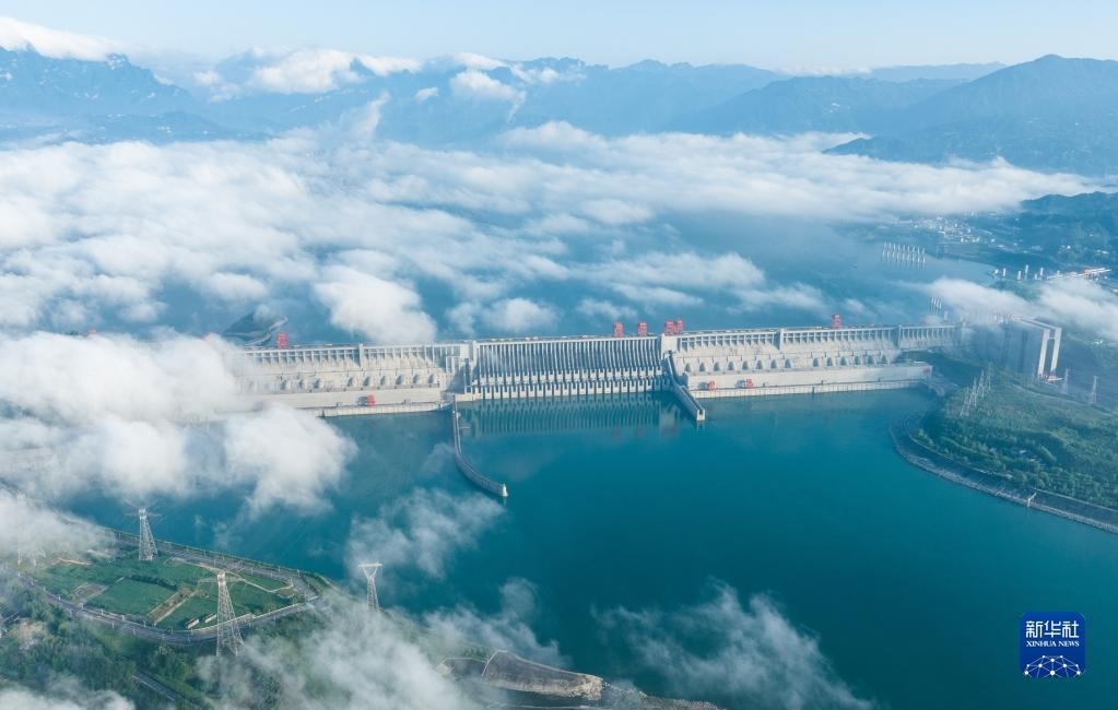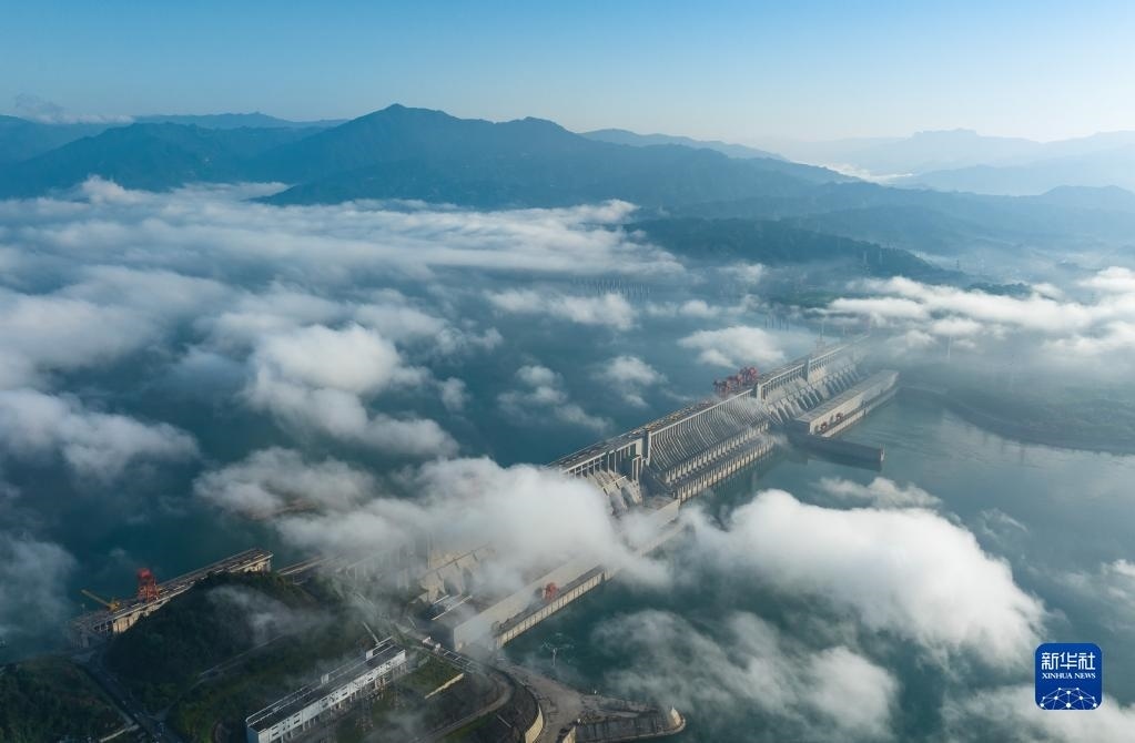 當日,湖北宜昌雨過天晴,三峽上空云霧繚繞,美景如畫。