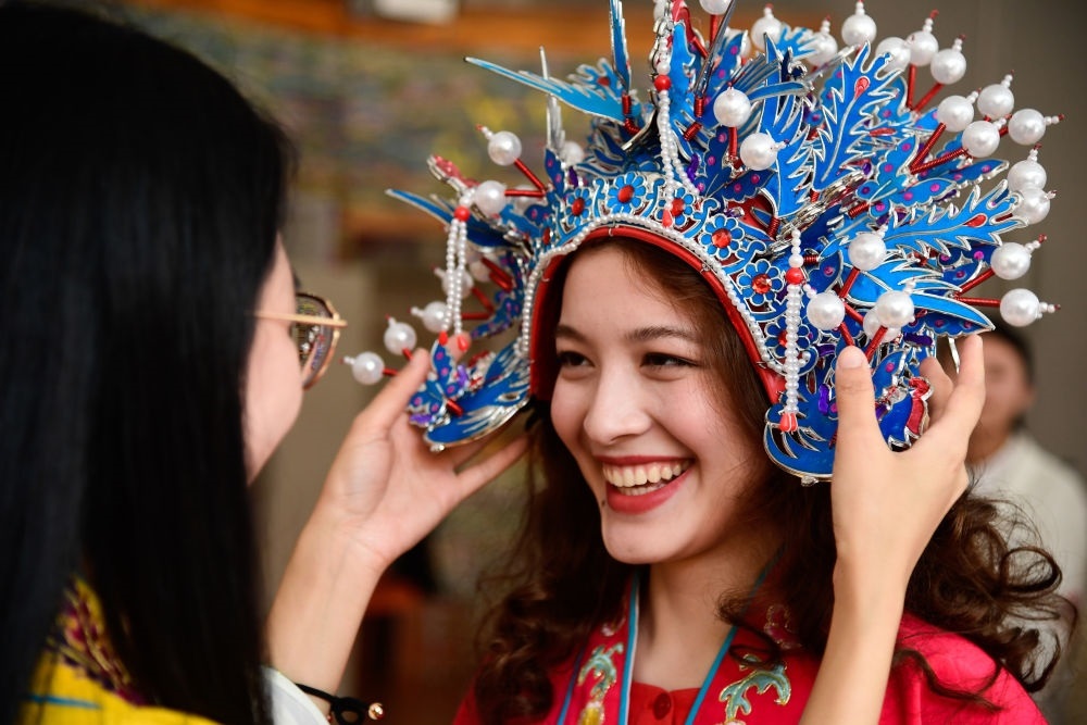 在青島的中國石油大學(xué)(華東)大學(xué)生活動中心,哈薩克斯坦留學(xué)生珍珠體驗(yàn)京劇文化(2018年5月3日攝)