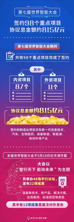 ·第七屆世界智能大會簽約98個重點(diǎn)項(xiàng)目,協(xié)議總金額約815億元。
