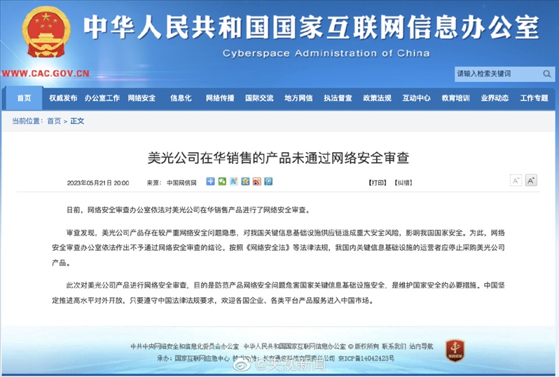 ·影響我國國家安全,美光公司在華銷售的產(chǎn)品未通過網(wǎng)絡(luò)安全審查。按照《網(wǎng)絡(luò)安全法》等法律法規(guī),我國內(nèi)關(guān)鍵信息基礎(chǔ)設(shè)施的運(yùn)營者應(yīng)停止采購美光公司產(chǎn)品。