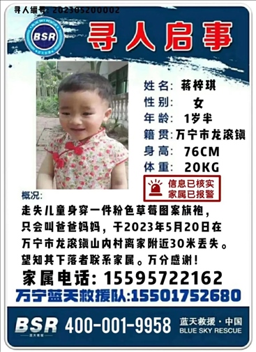 ·海南萬寧一歲半女嬰丟失一夜未歸,丟失地點(diǎn)離家僅30米。
