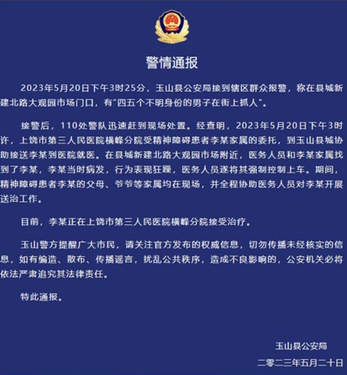 ·江西玉山警方通報“男子街上抓人”:系醫(yī)院接送精神障礙患者就醫(yī)。