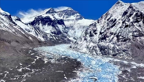 珠峰是“冰川家族聚集地”,廣泛分布著各類冰川。在珠峰北坡,純凈藍(lán)天下,絨布冰川于群峰間蜿蜒而下,晶瑩的冰塔錯落有致,壯麗奇幻。
