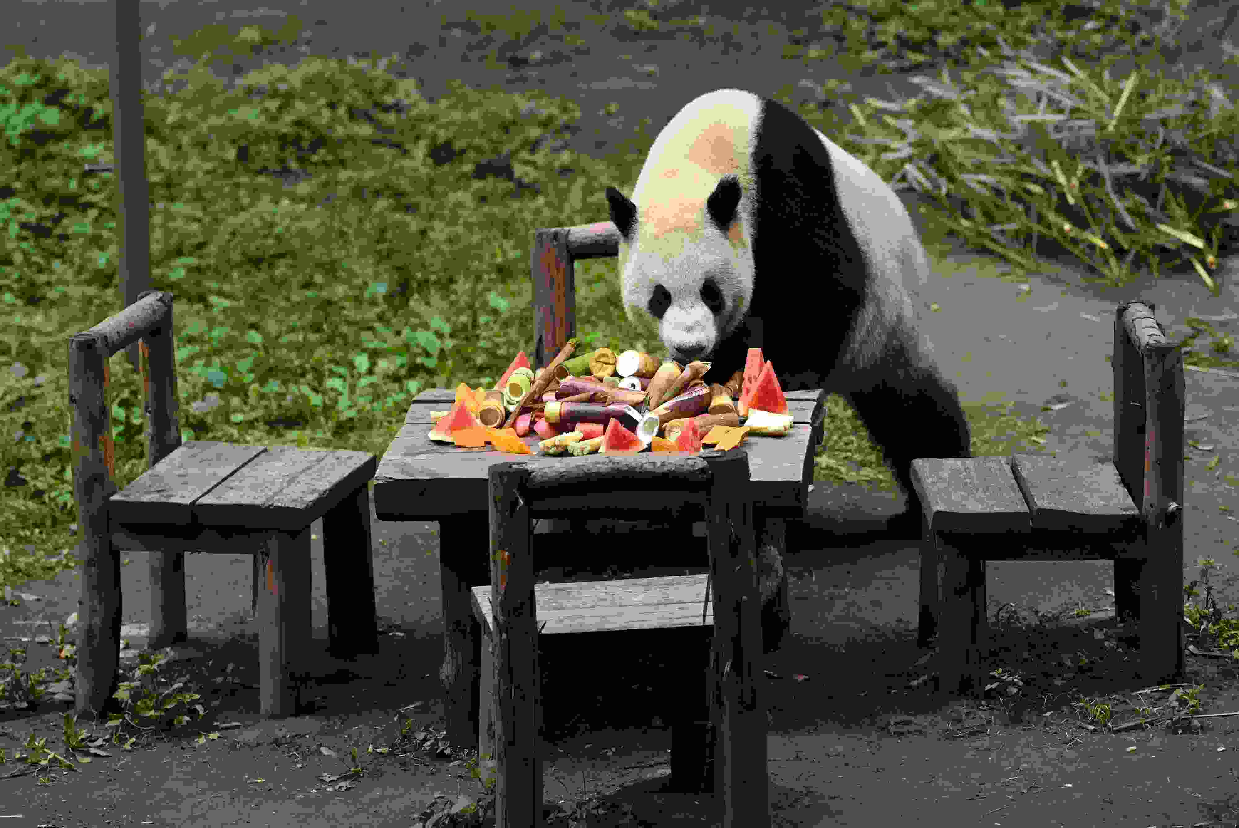 2023年5月21日,在重慶動物園內(nèi),大熊貓在桌邊挑選美食,萌態(tài)十足。 視覺中國